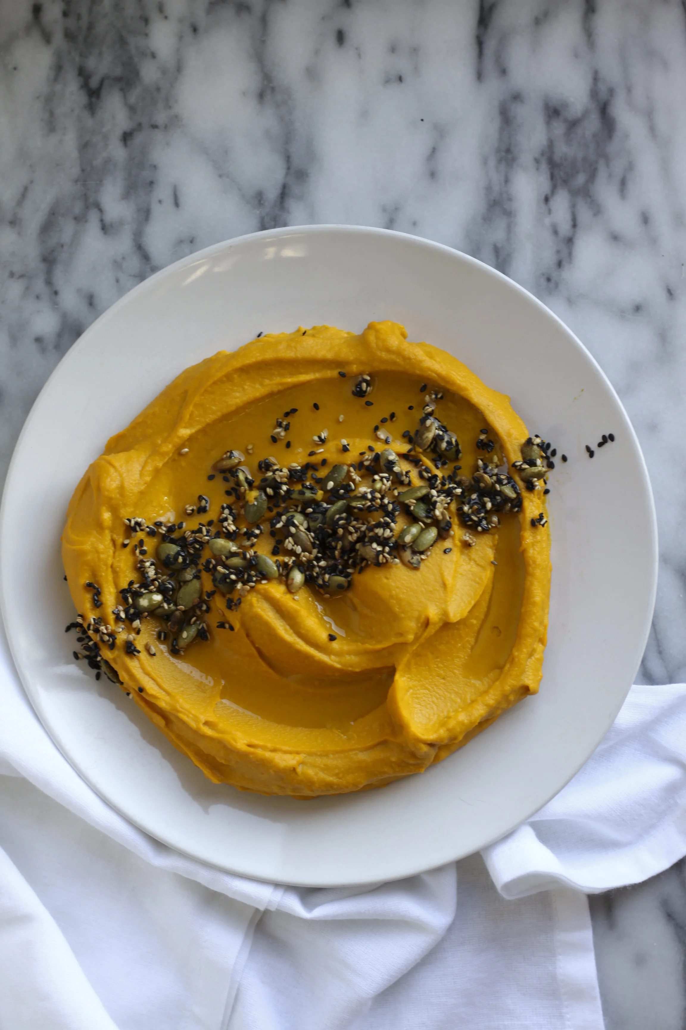 Instagram, food blogs and official food publications have been awash with Thanksgiving related recipes for days, if not weeks. I'm a little late to the game—but hopefully not too late for you to consider including this Kabocha Squash & Miso Hummus as part of your feast (or as a starter before the main event). I made this hummus for the Rosh Hashanah dinner I hosted at the beginning of September—the Jewish new year, another celebratory gathering of family and friends—and literally at least three of the ten people who attended asked me for the recipe. If it doesn't end up making the final cut for this Thanksgiving, that's totally chill. It's hummus, so you are literally justified in making it whenever you want (or whenever winter squash is available).The cool thing about making things from scratch that you often buy at the store—like beans, salad dressings, or hummus—is that once you know the formula and process, you can get really wild with your flavors and mix-ins. Winter squash, chickpeas and tahini are a no-brainer together; the secret, wow-factor ingredient here is definitely the miso.Miso: Your New (Probiotic) Secret Weapon Flavor BombMiso, probably most familiar to Westerners in the form of miso soup, is a traditional Japanese paste made when soybeans, barley and/or rice are fermented with a fungus called Aspergillus oryzae. After hanging out with the fungus in a very dark spot for some months or years, miso is born and we get to reap its many benefits. If you hate kimchi (like I do), miso is a great fermented ingredient to incorporate into your diet. (I also encourage you to incorporate it into your diet even if you like kimchi, because it is far more delicious [subjective opinion] and far more versatile [objective fact]). As a probiotic, it helps support digestion and maintain (or enhance) the health of the bacterial flora in your gut—which is super important in our overall health! Additionally, miso has a unique blend of salty, sweet and umami (savory) flavors, which makes it an awesome staple ingredient to add depth of flavor to vegetarian cooking.Because miso is a probiotic food, it should be stored in the refrigerator and never boiled or heated in the oven—else the live, active cultures, enzymes and nutrients will be decimated. For this same reason, be sure to buy organic, unpasturized miso paste when you shop for it. Miso comes in a variety of flavors or colors depending on its ingredients and the length of its fermentation process. Varieties range from "white" to "dark brown," with the lighter colors leaning towards a more mild, sweet flavor and the darker colors being more salty and pungent (you can get a complete guide here). Because of its lighter flavor, I find the sweet white or yellow miso to be best in recipes where no heat is involved, like dressings and dips.Kabocha Squash: Butternut's Cooler CousinI had never heard of Kabocha squash until I worked at a farm-to-table online grocer two years ago. Once I first learned how to say "kabocha," my mouth could no longer articulate the word "kombucha". (I've since been cured of that particular affliction.) Once I first baked it, my taste buds refused to let me cook butternut anymore. It is somehow just a bit richer, a bit denser, a bit sweeter, and a bit more flavorful, cumulatively creating the most amazing winter squash experience I've ever had. To be fair, it is a pain in the ass to peel and cube. But if you are puréeing a squash for any reason, kabocha is the way to go. (And if for some reason you are unable to find kabocha at the market, you may sub Butternut in this recipe.)Of Japanese origin, kabocha squash finds common ground with its winter squash kin as one of the most substantial sources of alpha-carotene and beta-carotene in our entire diet. These carotenoids are primary antioxidants, which help fight free-radicals in our bodies and have anti-inflammatory and immune supporting properties. Suffice to say that between the protein packed chickpeas, calcium and omega rich tahini, chock-full-of-probiotic miso and carotenoid crazy squash, this is one health supportive dip. I don't know whether it's a good or bad thing that no one will be thinking about how healthy it is when they taste how delicious it is. But hey, both nutritional health and real food flavor are small yet mighty things to be grateful for this Thanksgiving...even when our world feels like it's falling apart. *Sources: SF Gate, My New Roots & WH Foods.