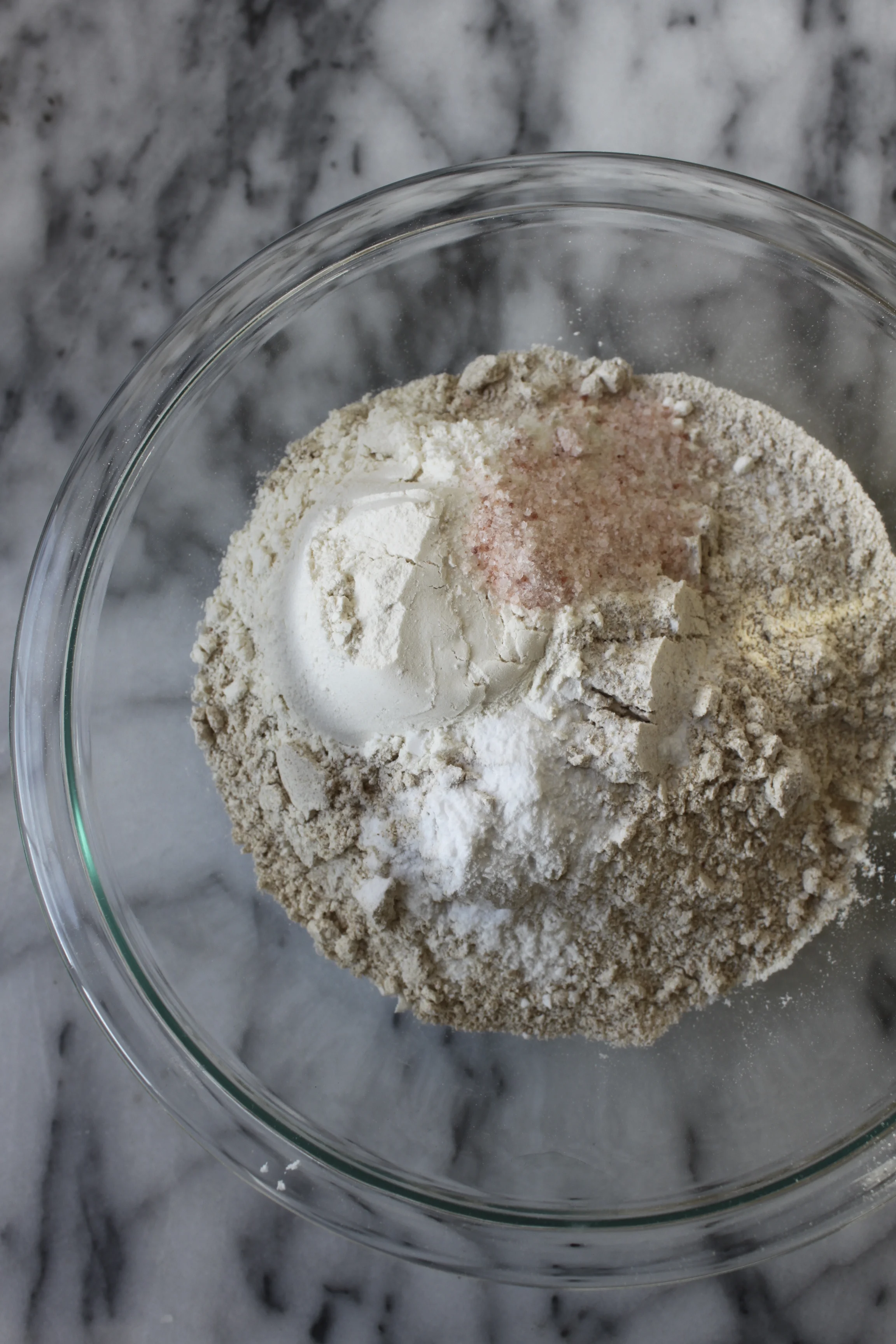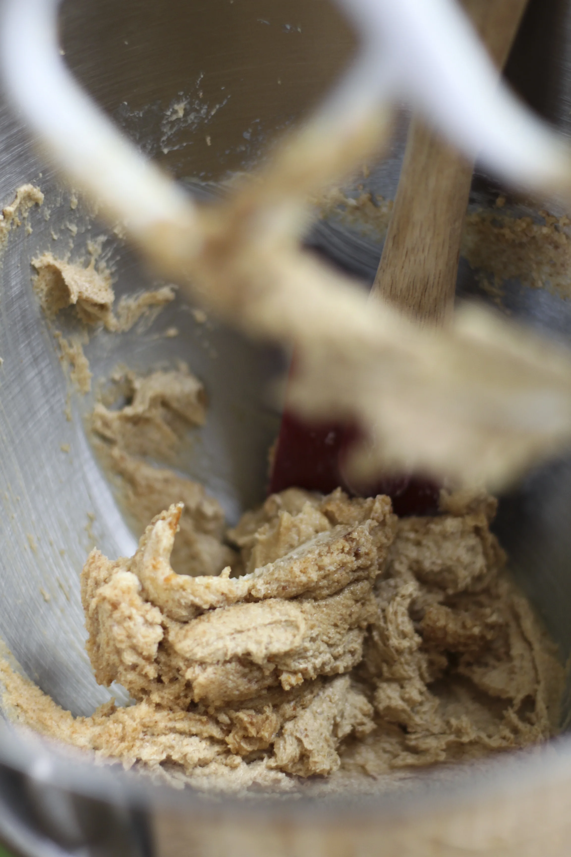 5. Add the flours, salt and baking soda to the batter. Mix at a low speed until just incorporated. There can still be a few bits of flour peeking through.