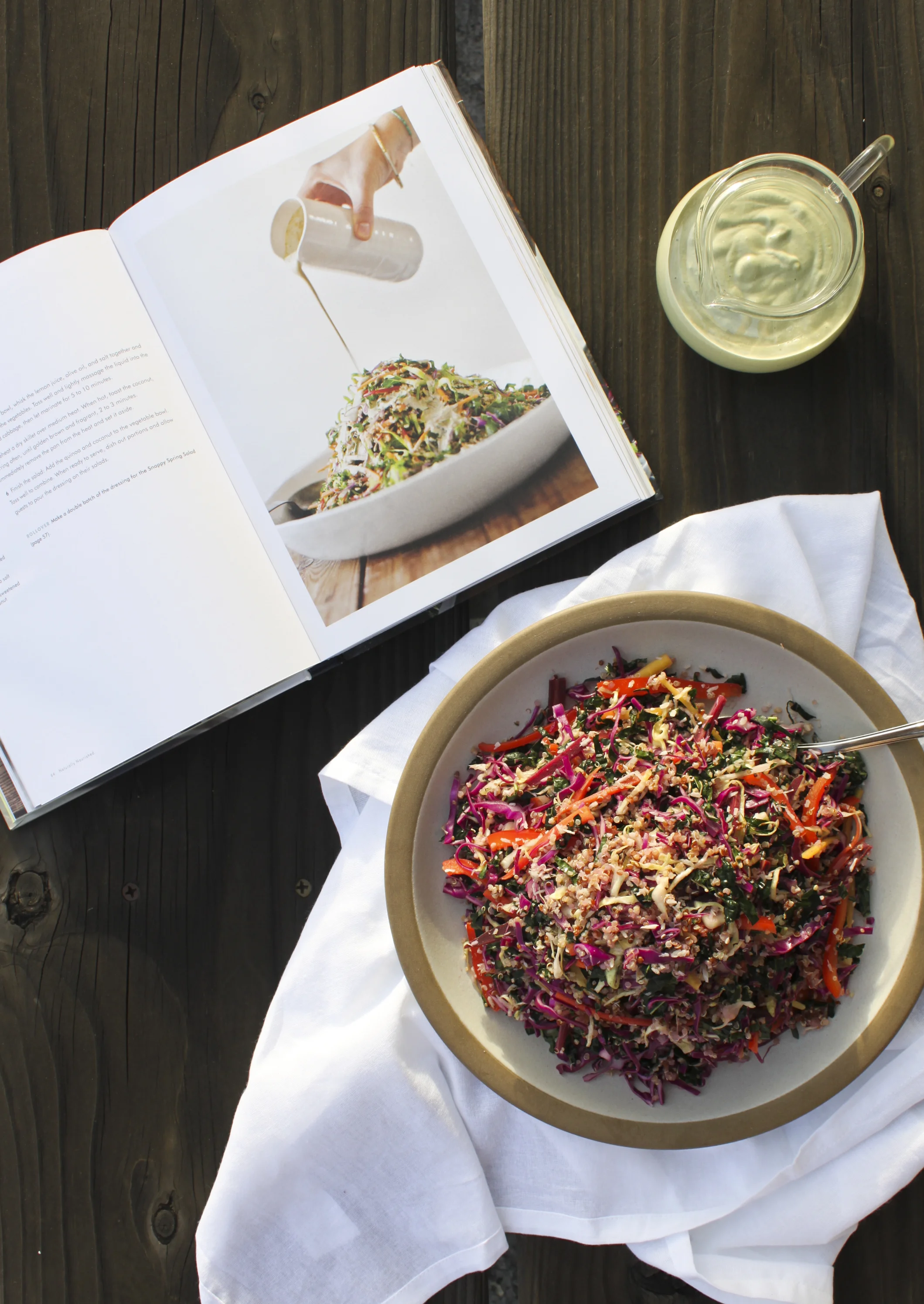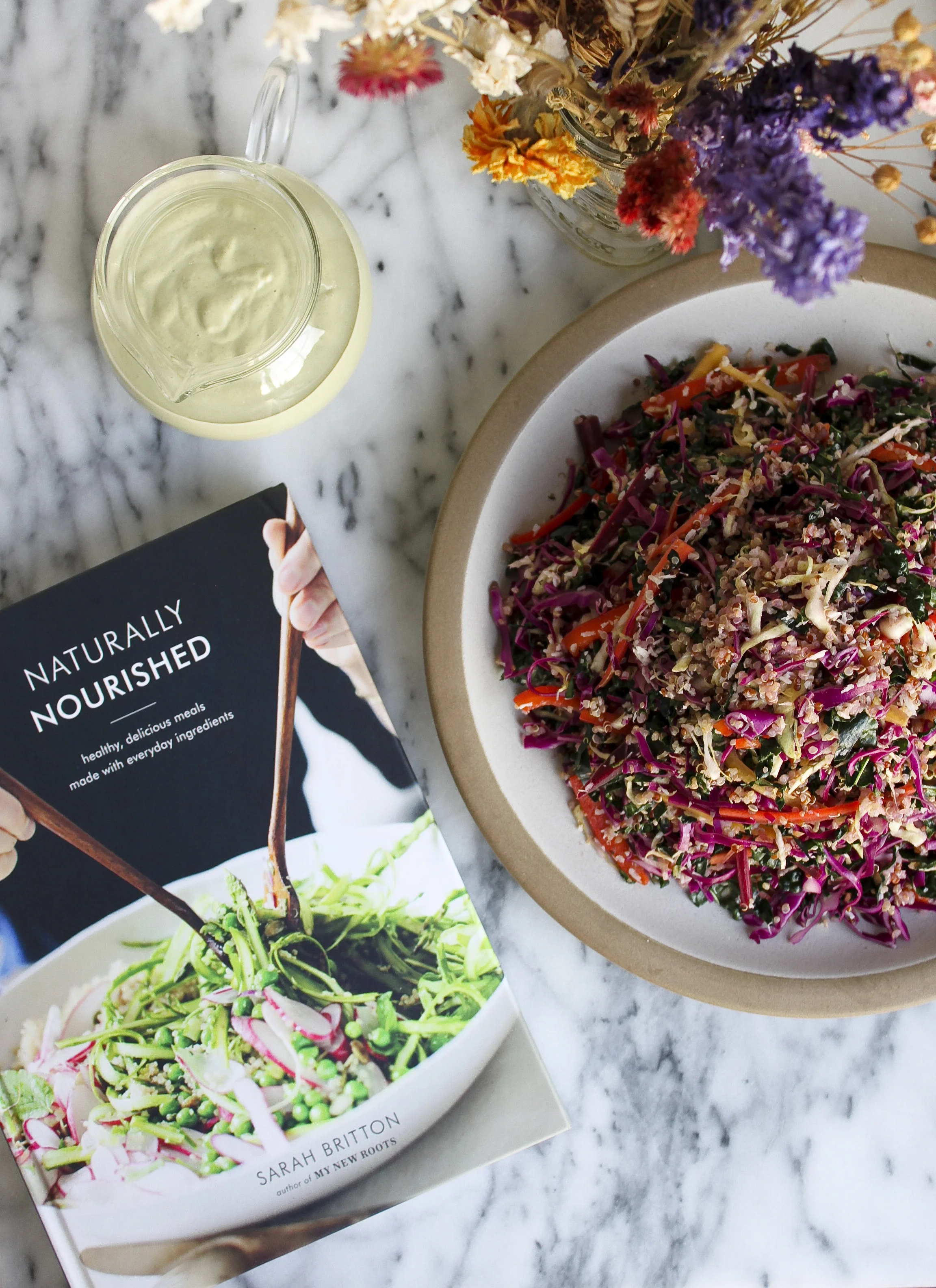 The clarity and enthusiasm of Sarah's writing and recipes (not to mention stunning photography), which permeate My New Roots and amplified my own excitement around learning to cook and eat well, are present on every page of Naturally Nourished. It is the perfect book for anyone and everyone, but particularly for those of you who are less confident in the kitchen and/or have limited access to fancy/intimidating ingredients that often pop up in plant based recipes. Constructing every recipe exclusively from foods that you can find at your run-of-the-mill supermarket, Sarah focuses on simple cooking techniques and flavor combinations that you can use to transform everyday whole foods (vegetables, legumes, whole grains, nuts, seeds, fruits, herbs) into divine tasting and super satisfying meals. Broken into chapters based on course—Soups, Salads, Mains, Sides and Small Plates, and Savory and Sweet Snacks—Sarah helpfully includes an introductory section in which she discusses the building blocks of composing a meal, why your freezer should be your new best friend, and how to boost flavor in any dish. With this, you'll easily develop an understanding of the why behind the recipes tasting delicious when you make them, in addition to skills to help you easily integrate healthy, from-scratch cooking into your everyday routine.I chose to share Sarah B.'s Coconut-Quinoa Coleslaw with Minty Tahini Dressing for a number of reasons. #1: Tahini. I am totally obsessed. (Sarah is too, incidentally.) #2: Mint. My absolute favorite herb, enhancing everything from salads to shakshuka to smoothies. #3: Seasonality. We're just now starting to see produce turn from winter to spring, but not enough that I felt comfortable taking on any of her spring-focused recipes. Cabbage is not only abundant in winter, but all year long! This means you can make this dish now as well as a few months from now. Which is great, because...#4: Picnics. Everyone's favorite summer pastime, whether at a park, a creek or the beach. This recipe is great for a crowd, super easy to transport and totally satiating (which will come in handy when you need something to absorb all that picnic beer).A mayo-free, much more flavorful (in my humble opinion) riff on coleslaw, this dish is like a crunchy, vibrant party in your mouth. Filled with protein from the quinoa, antioxidants and fiber (nearly 1 gram for every 10 calories!) from the raw cabbage, natural sweetness from the toasted coconut and healthy fats and calcium from the tahini sauce, coleslaw never made your body so happy. Seriously.So hey, go make this slaw. Then go get yourself a copy of Naturally Nourished and dig in to initiate the whole foods revolution that will, slowly but surely, change your life.