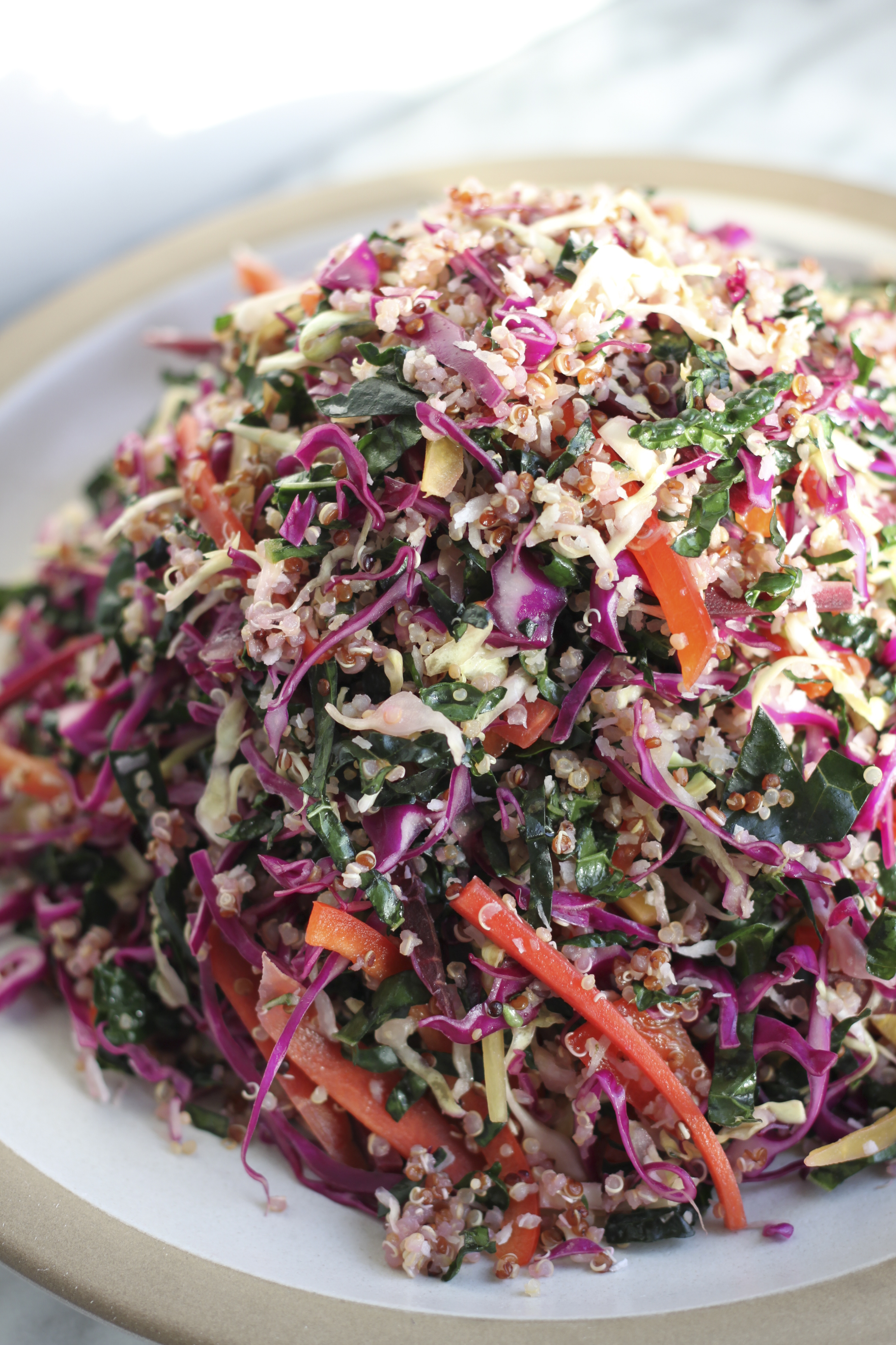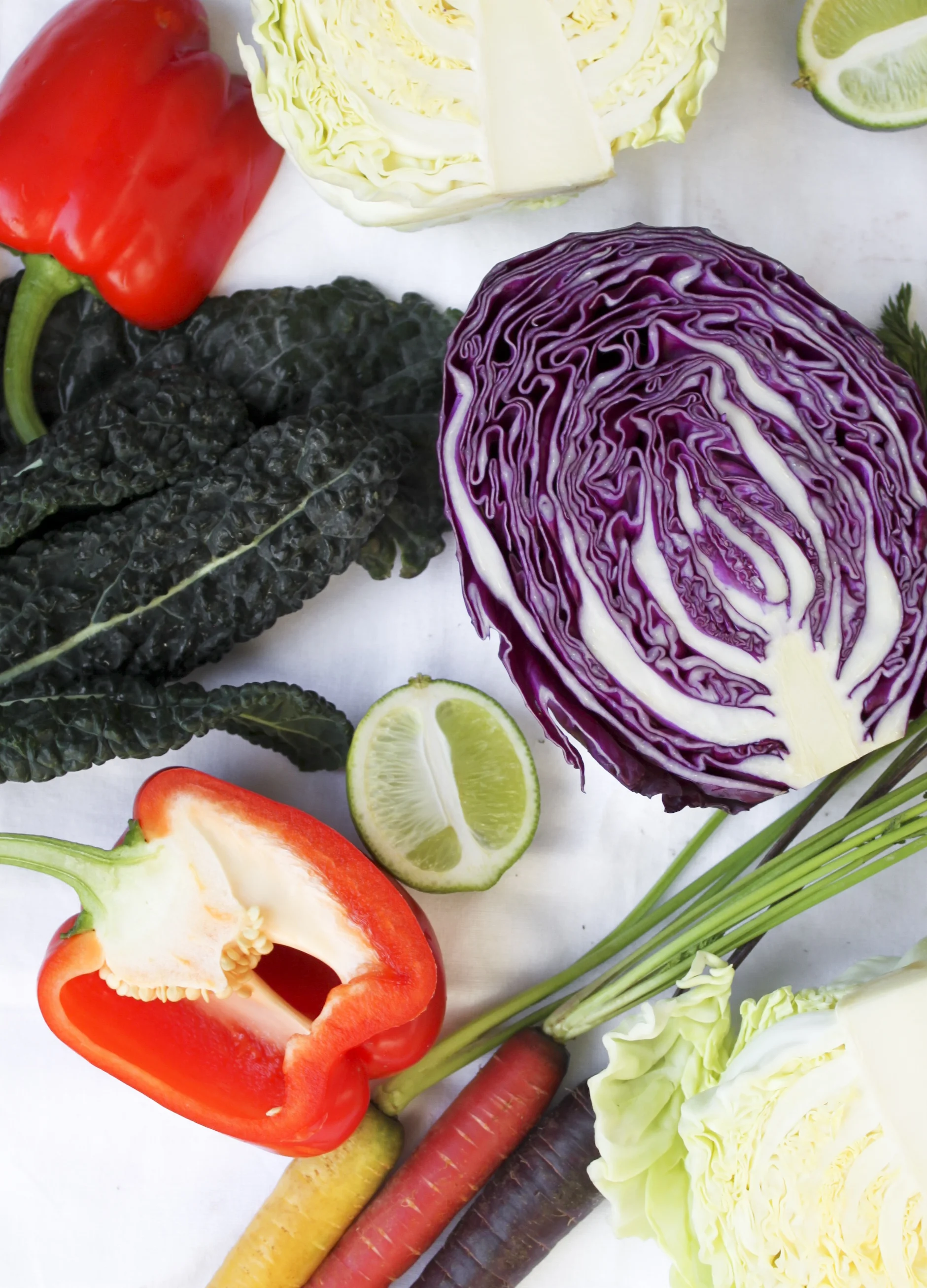 3. In a large bowl, combine the cabbages, kale, carrots and bell pepper.