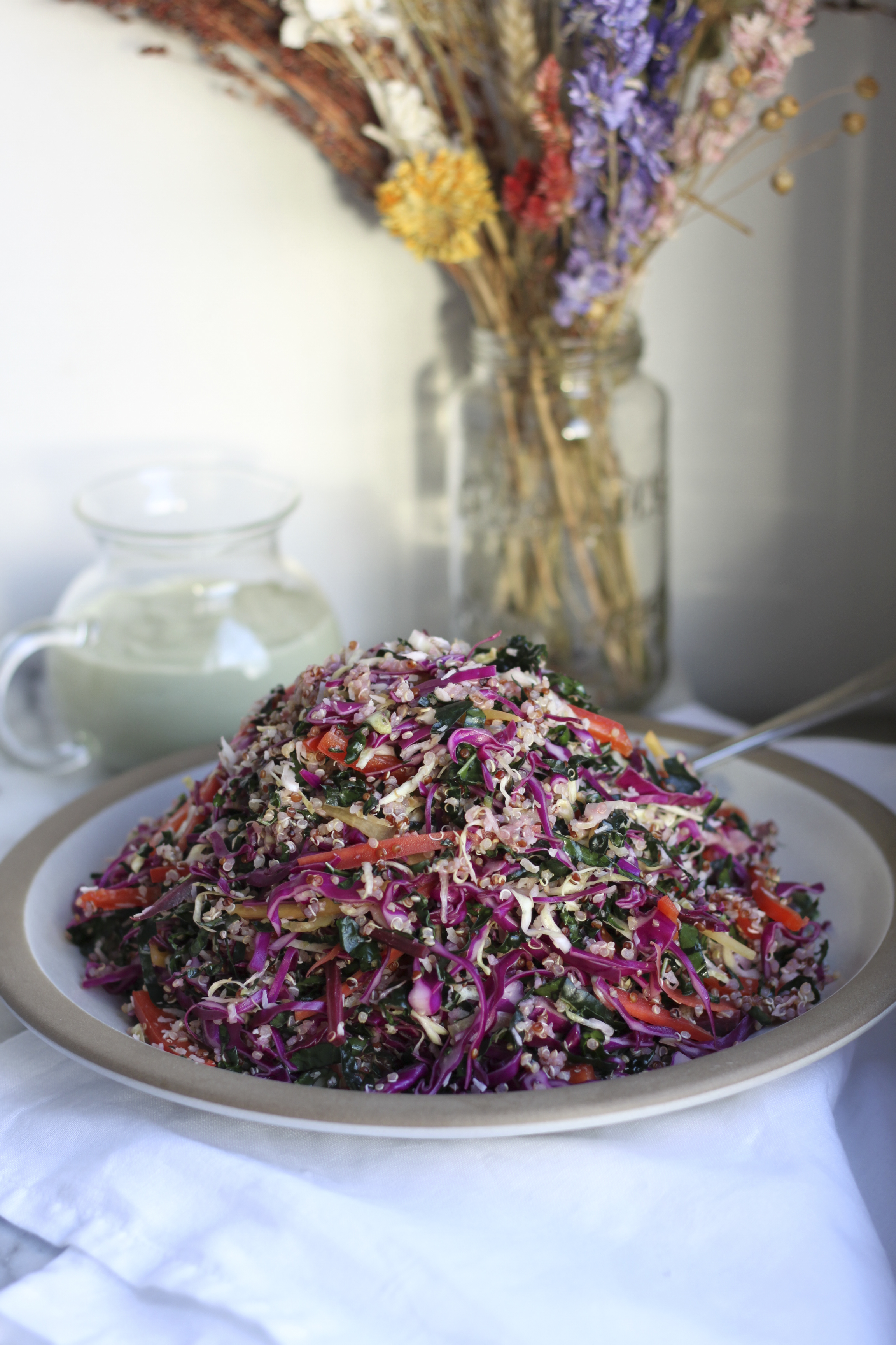 6. Finish the salad: Add the quinoa and coconut to the vegetable bowl. Toss well to combine. When ready to serve, dish out portions and allow guests to pour the dressing on their salads.